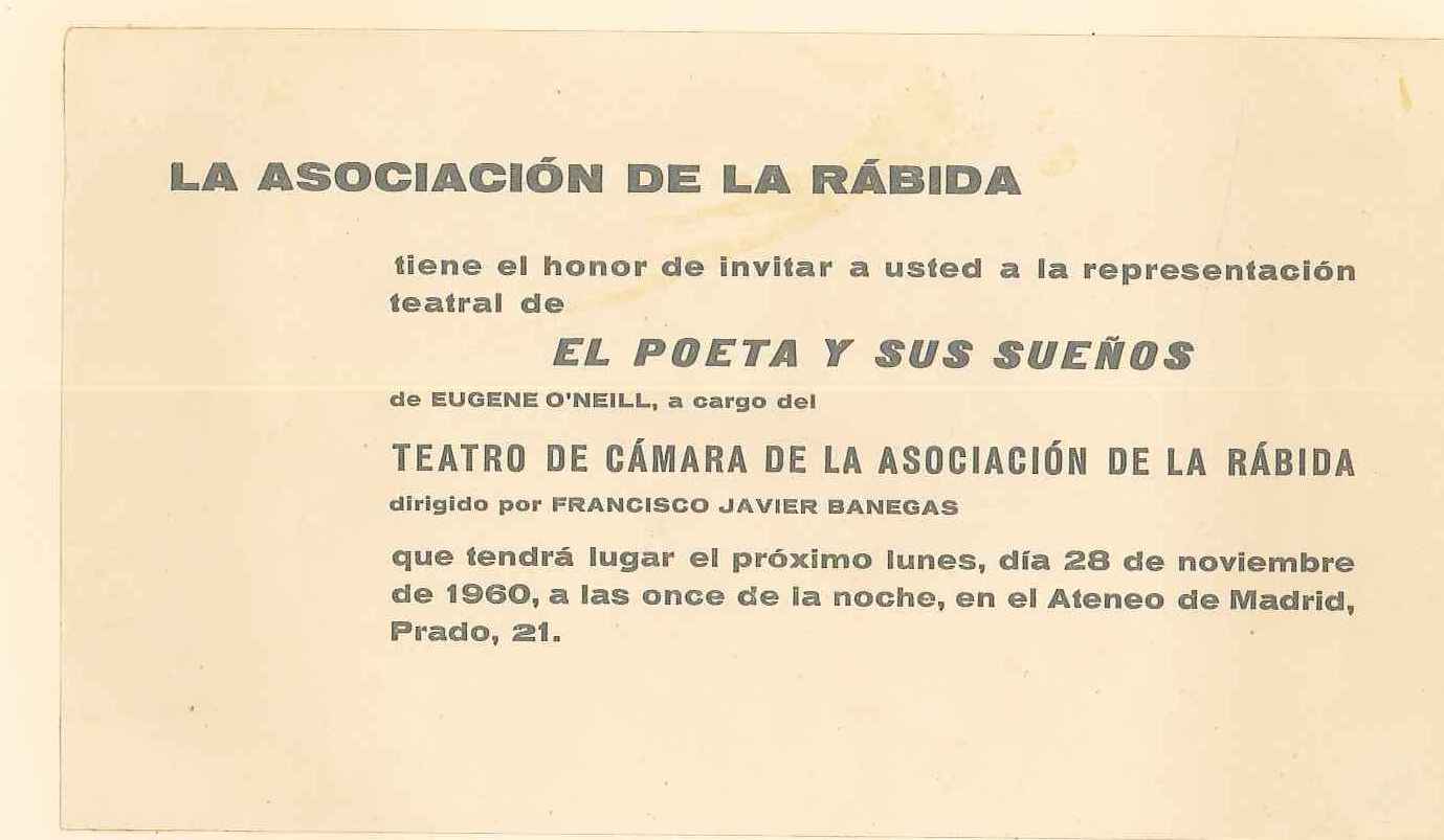EL POETA Y SUS SUEÑOS”. Drama en cuatro actos –segundo y tercero sin interrupción- original de EUGENE O’NEILL Traducción de León Mirlas. Adaptada por Francisco Javier Banegas. Estrenada en el Ateneo de Madrid, el 28 de noviembre de 1960. Reparto (por orden de aparición). Maloy: Manuel Nantón, Gregan: Emilio Vega, Sara: África Martínez, Nora: Monserrat Salvador, Mélody: Carlos Villafranca, Roche: Agustín de Juan, O’Dowd: Carlos Polac, Ryley: José Salcedo, Deborach: Margarita Calahorra, Gasby: Manuel Lorenzo Guerrero.